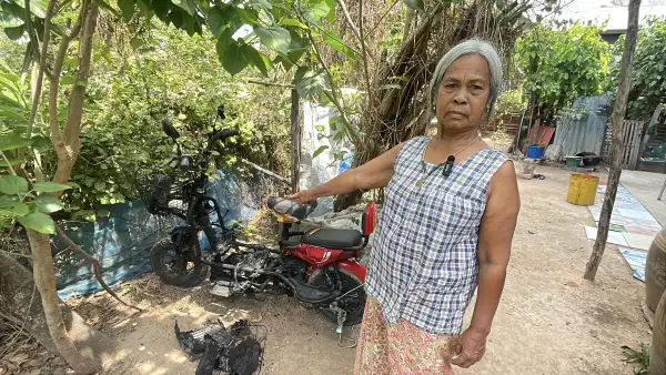 ผู้สื่อข่าวลงพื้นที่บ้านเลขที่ ๒๖ หมู่ที่ ๔ ต.บ้านปรือ อ.กระสัง จ.บุรีรัมย์ ซึ่งเป็นบ้าน ๒ ชั้นครึ่งปูนครึ่งไม้ พบนายเคลื่อน ดีกระโทก อายุ ๘๒ ปี และนางคราม ดีกระโทก อายุ ๗๑ ปี สองสามีภรรยาเจ้าของบ้าน พาไปดูซากรถจักรยานไฟฟ้าที่จอดทิ้งไว้ในสภาพถูกไฟไหม้เสียหายวอดหมดทั้งคัน