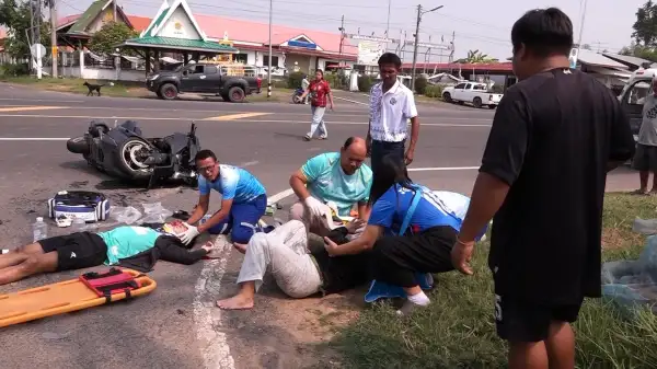 อำเภอลำปลายมาศ พนักงาน อบต.ผไทรินทร์ ขี่รถจักรยานยนต์รีบพาแฟนสาวไปไลฟ์สดการแข่งขันฟุตบอล ถึง ๔ แยกรถกระบะพุ่งออกมาชนสนั่นร่างกระเด็นเจ็บ ๒ ผู้ใหญ่บ้าน เผยเกิดอุบัติเหตุเป็นประจำวอนหน่วยงานติดตั้งสัญญาณไฟจราจร